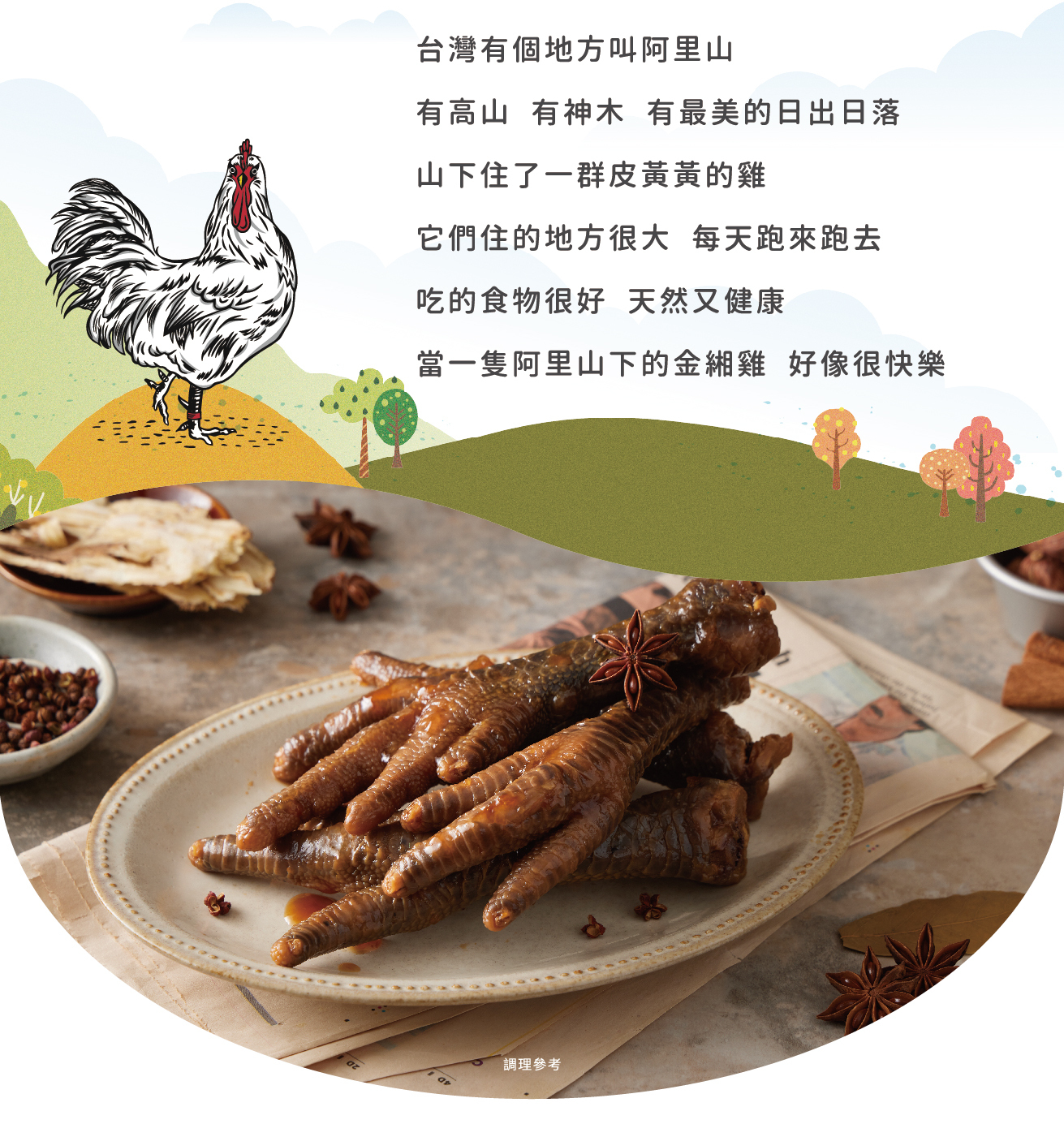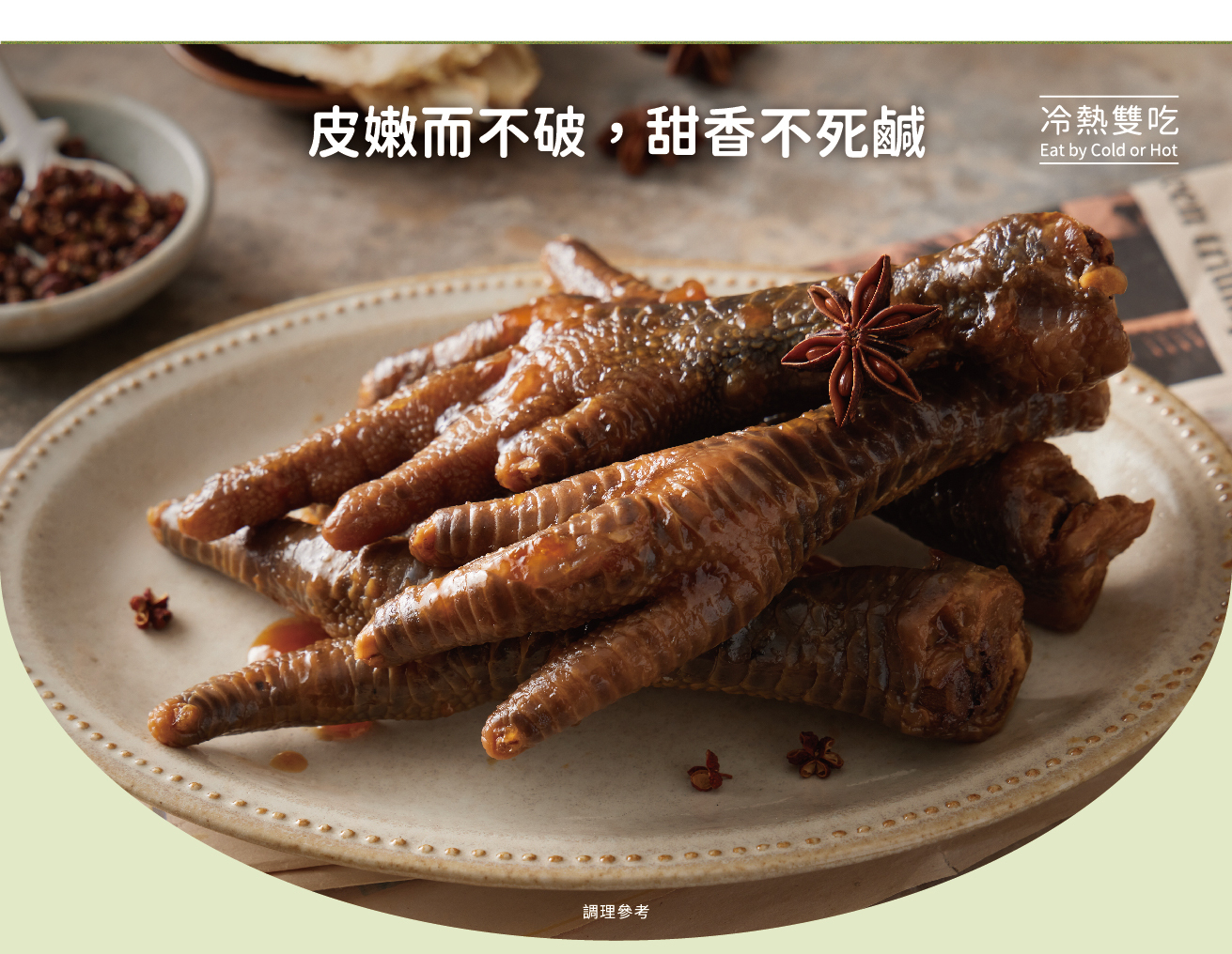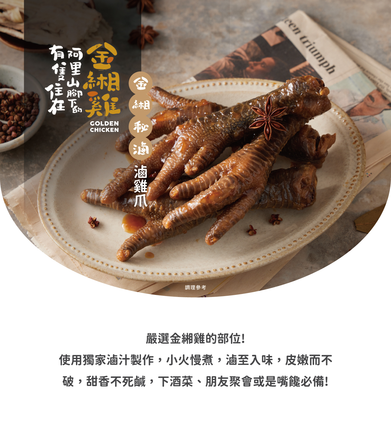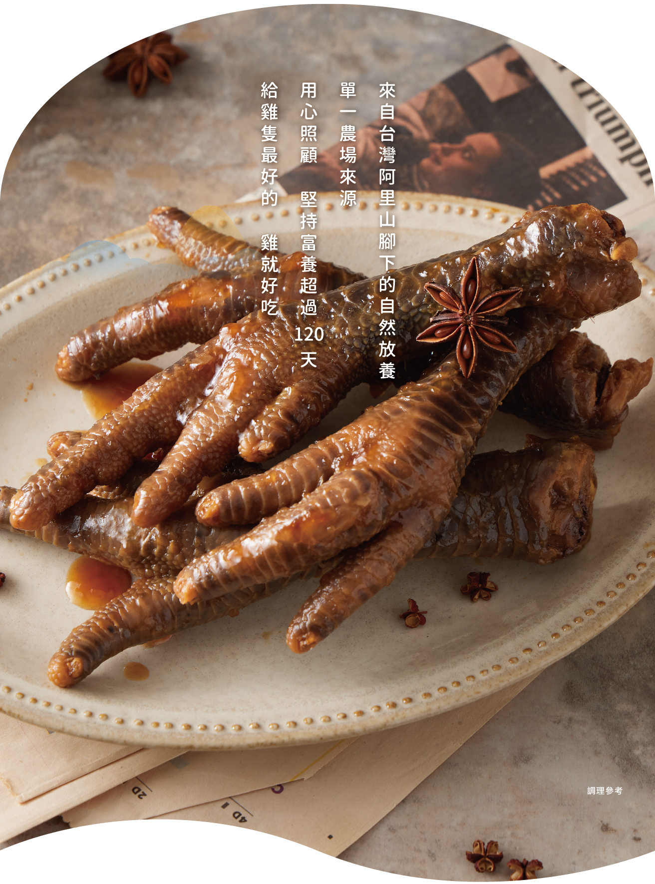 來自嘉義阿里山下的放牧土雞,雞爪含豐富膠原蛋白,使用獨家滷汁製作,加入中藥滷包小火慢煮滷至入味,起鍋後香氣四溢,吃起來皮嫩多汁、鹹香過癮,是朋友聚會或下酒菜的好選擇!