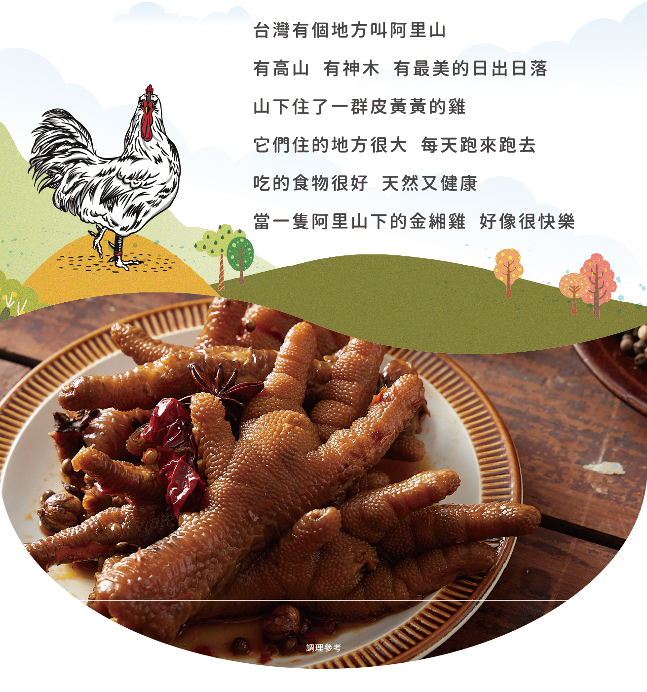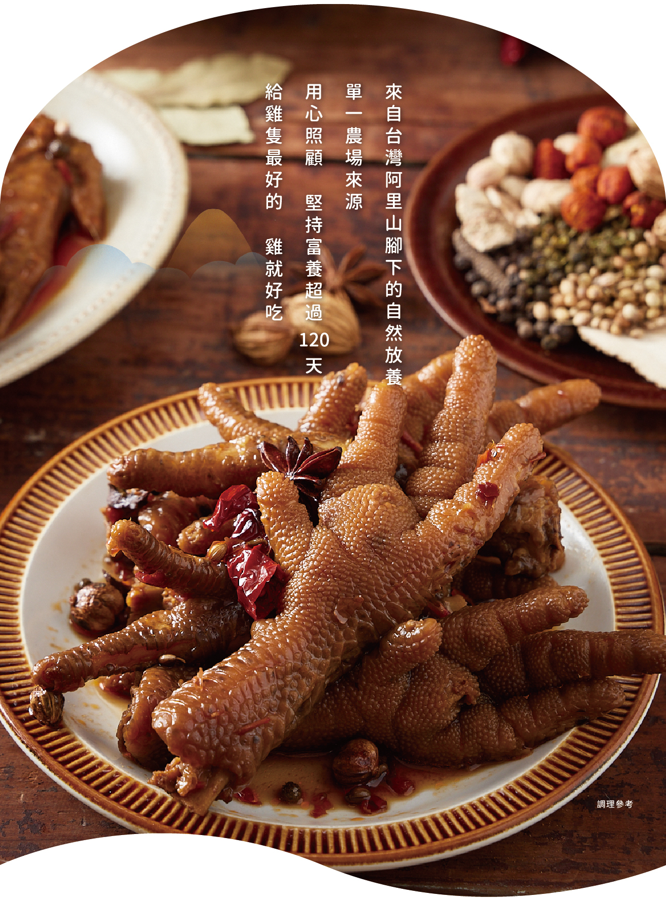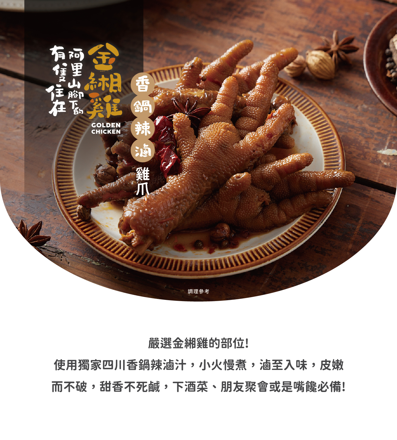 來自嘉義阿里山下的放牧土雞,雞爪含豐富膠原蛋白,使用獨家四川辣滷汁製作,加入中藥滷包小火慢煮滷至入味,起鍋後香氣四溢,吃起來皮嫩多汁、香辣過癮,是朋友聚會或下酒菜的好選擇!