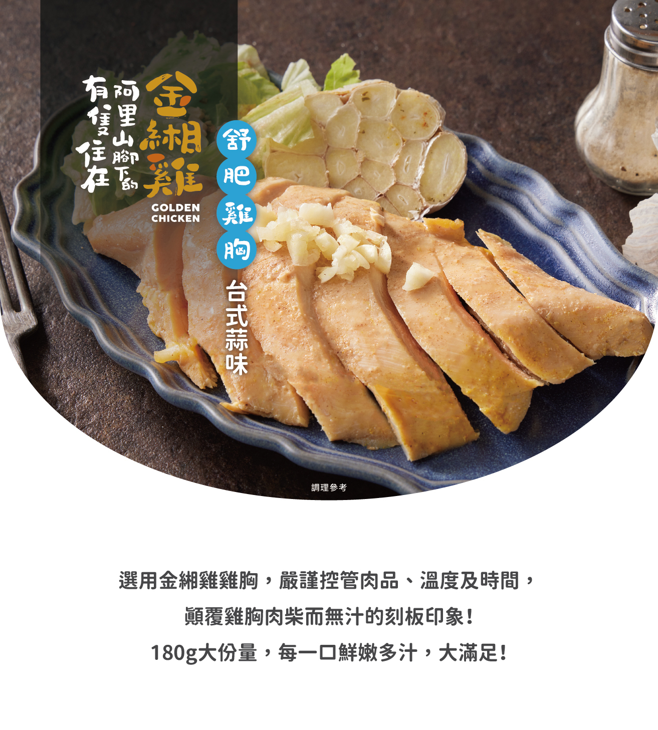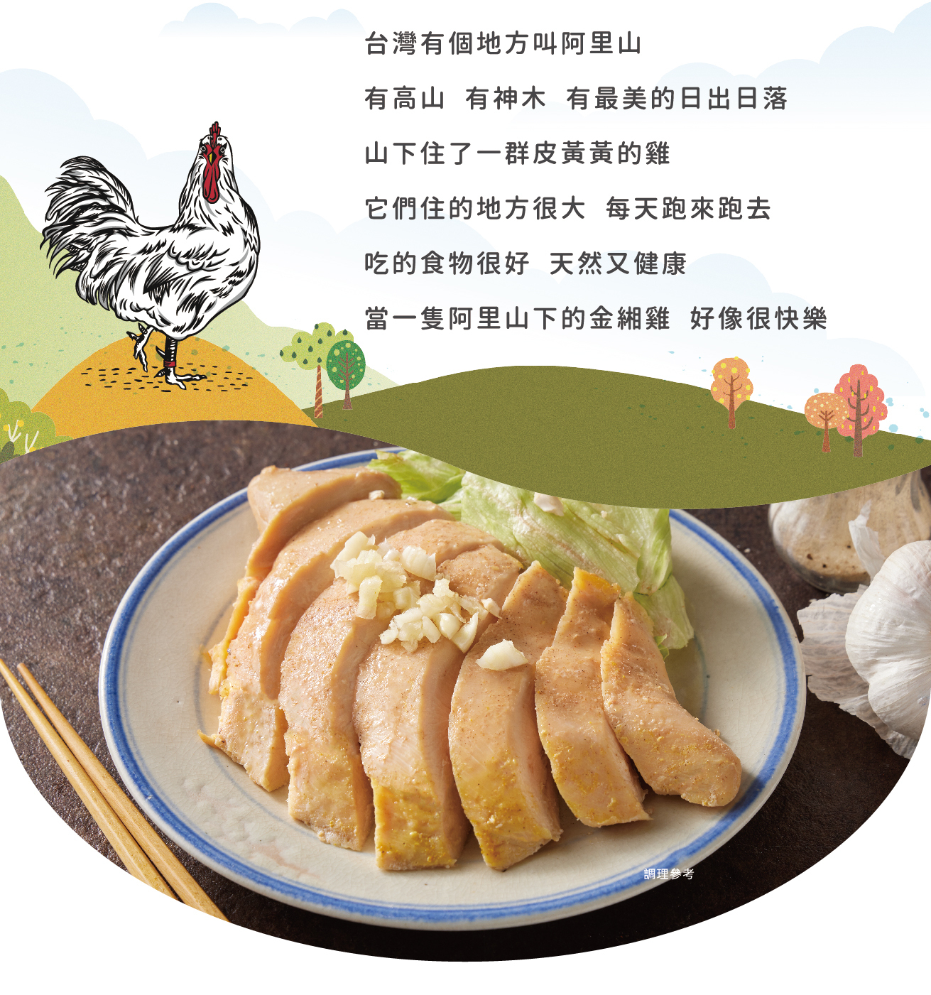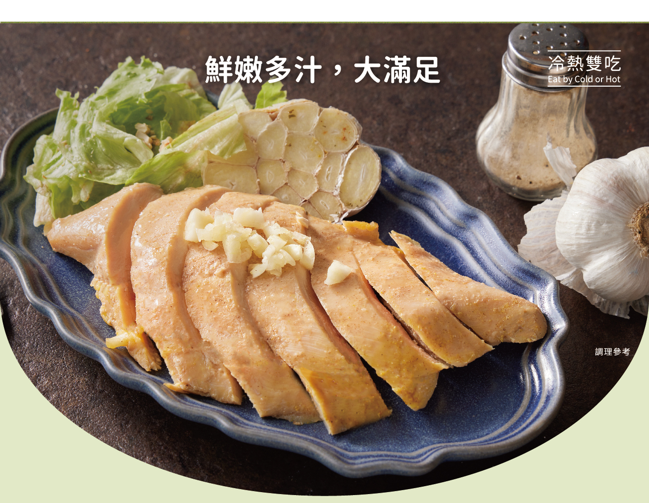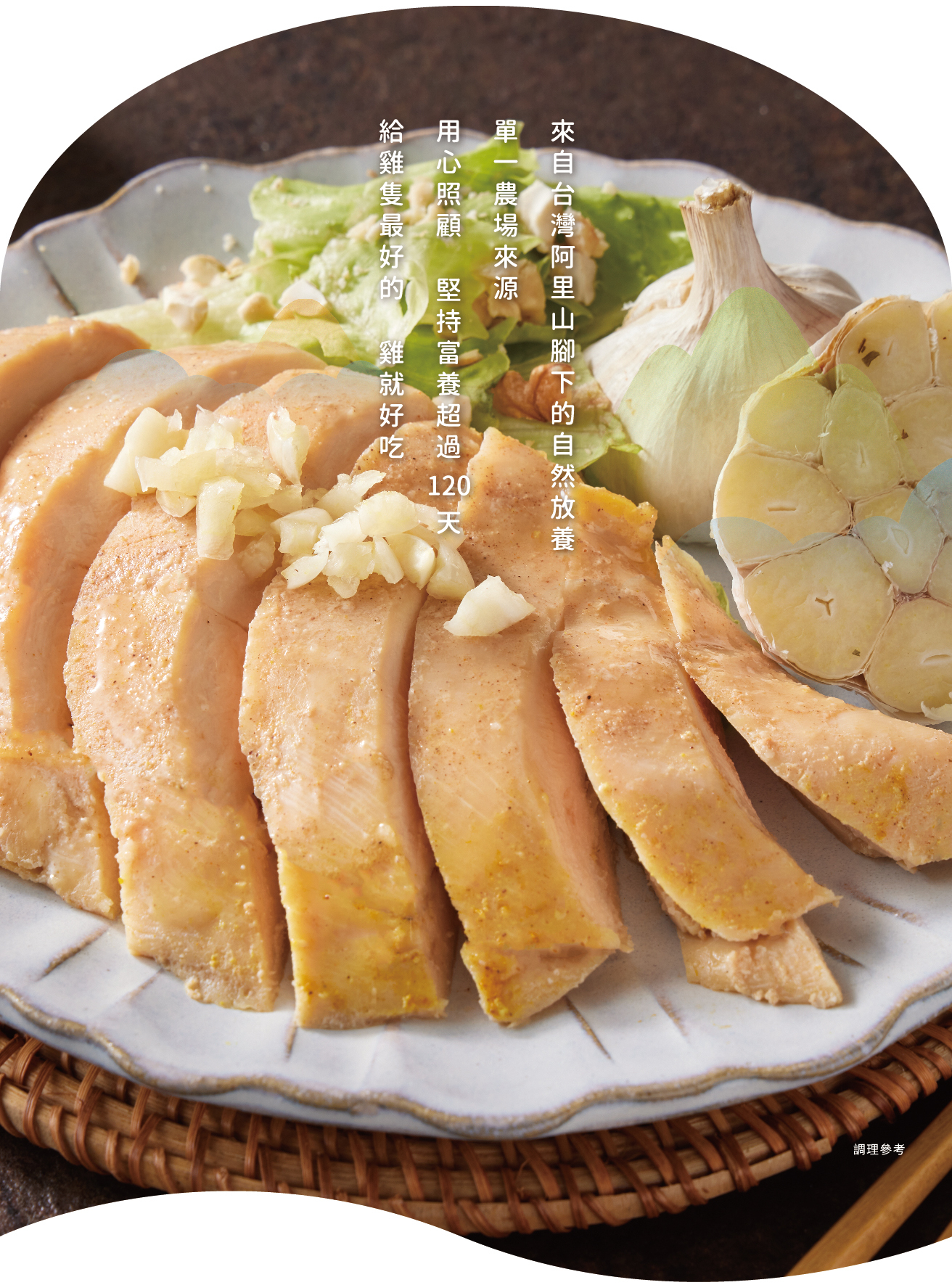 來自嘉義阿里山下的放牧土雞,雞胸肉低脂肪、高蛋白質,堅持選用天然食材,並經過低溫烹調製成,保留雞肉的營養多汁及鮮嫩口感。
