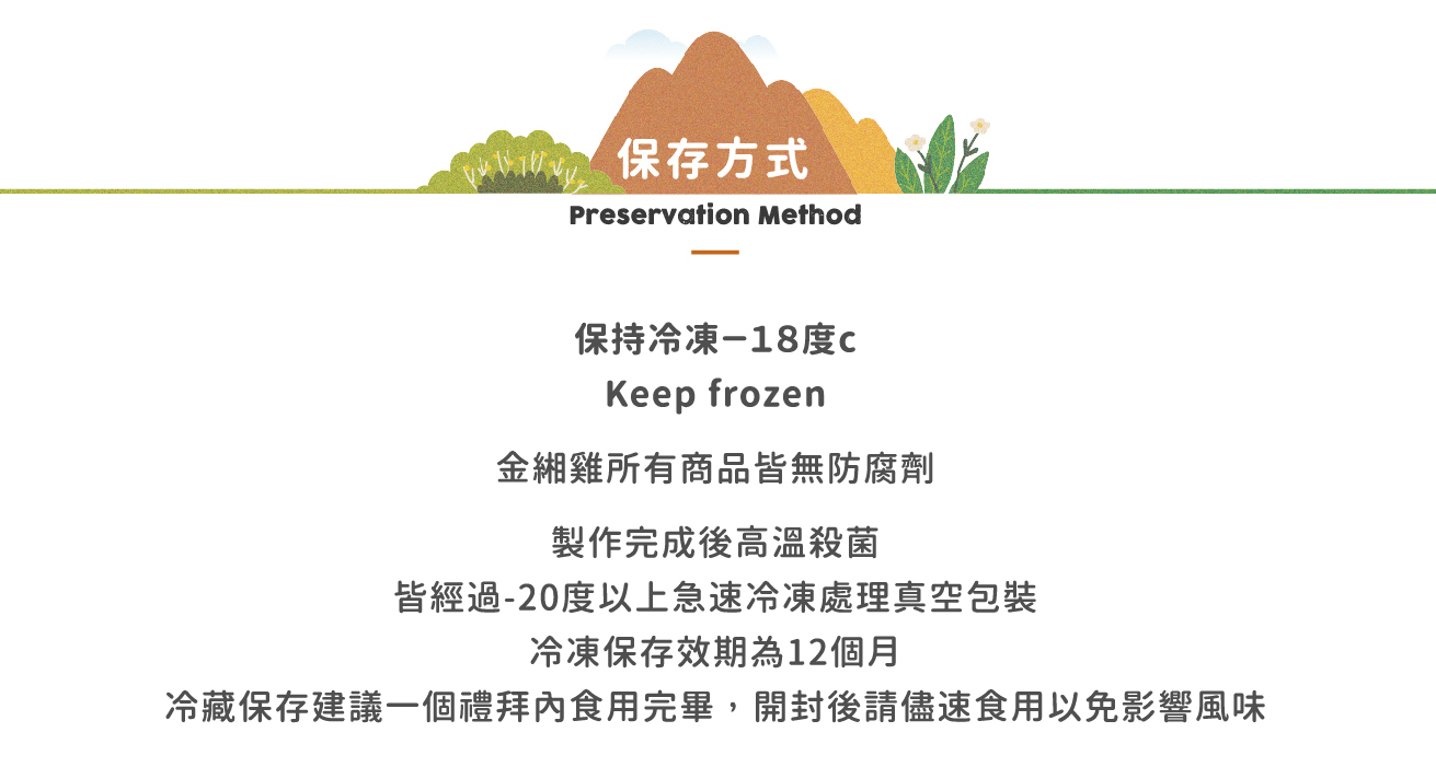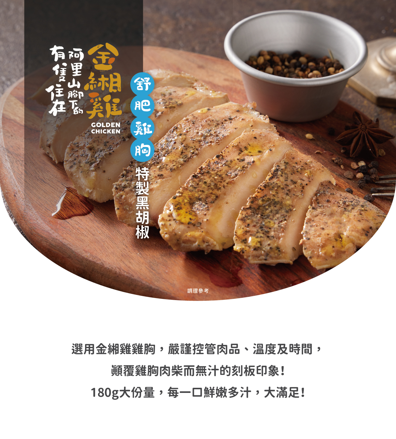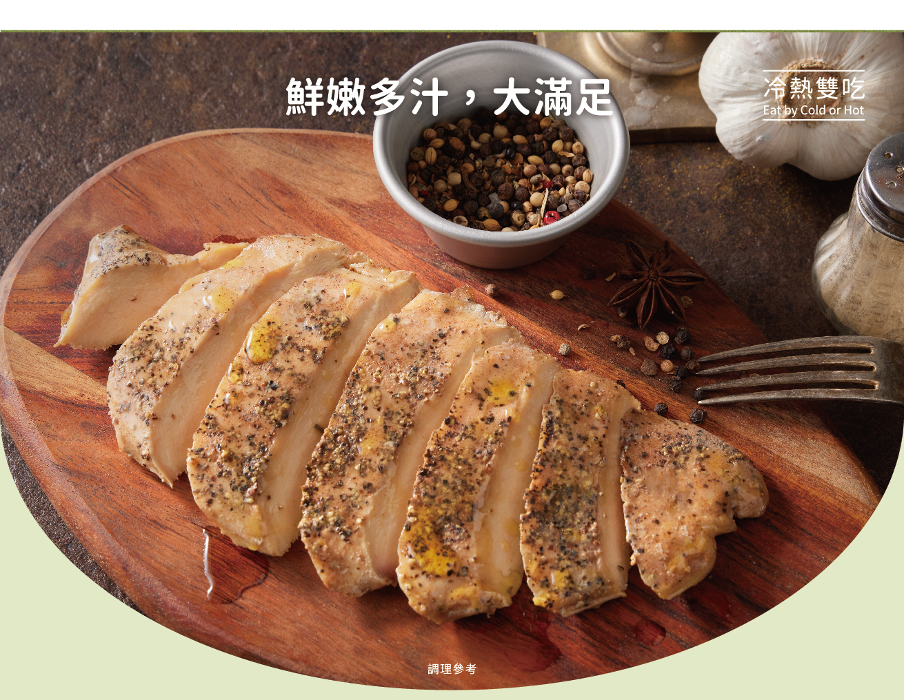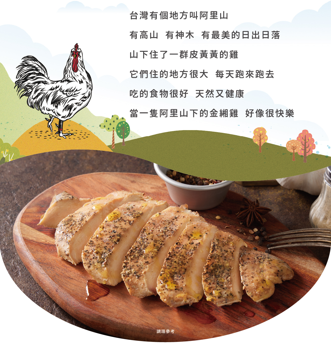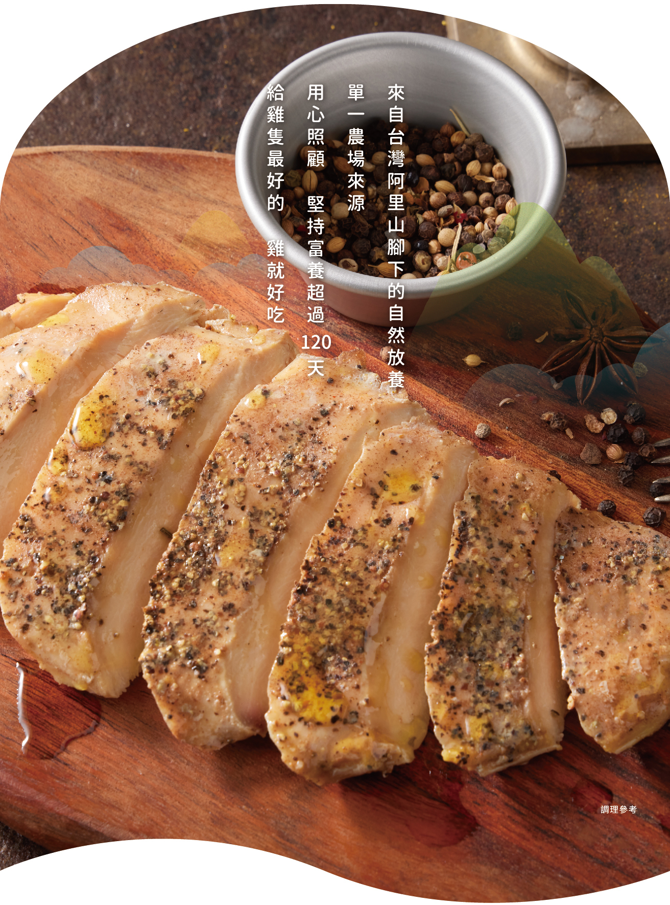 來自嘉義阿里山下的放牧土雞,雞胸肉低脂肪、高蛋白質,堅持選用天然食材,並經過低溫烹調製成,保留雞肉的營養多汁及鮮嫩口感。