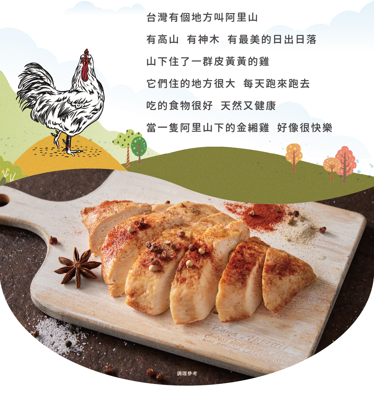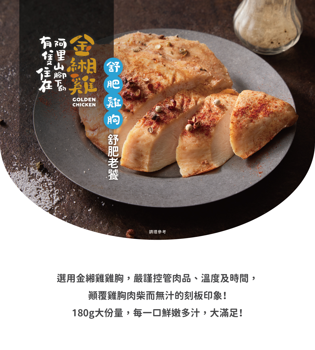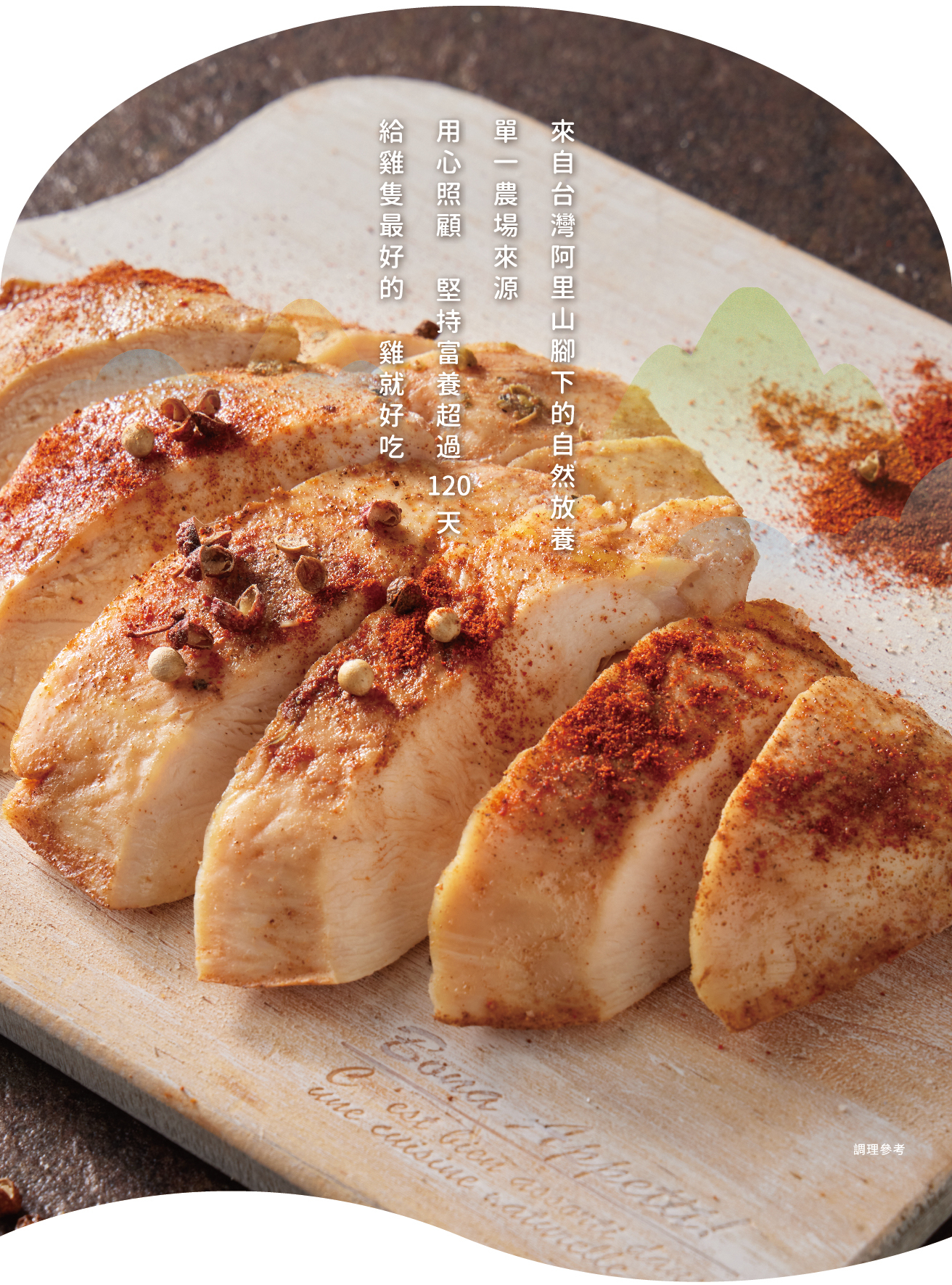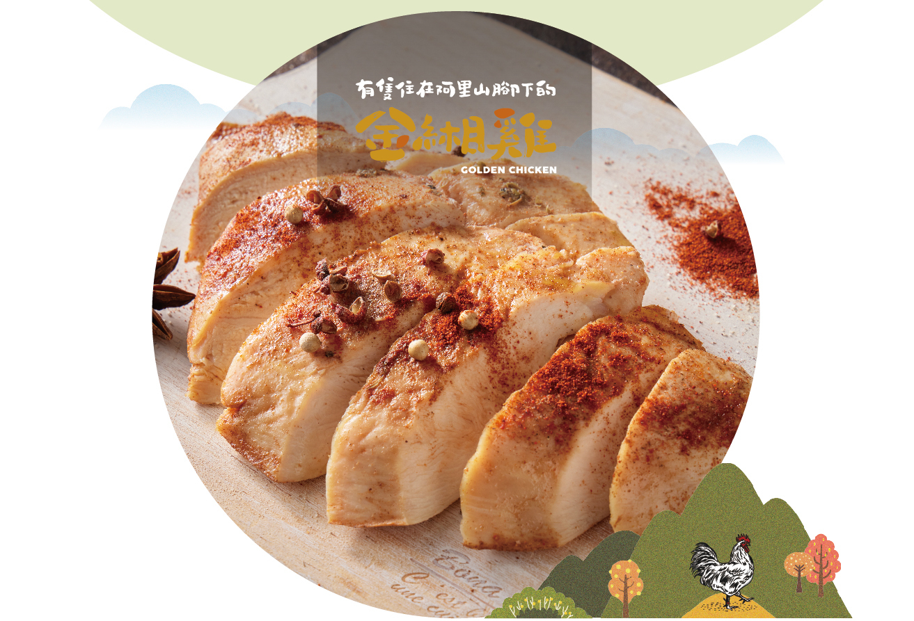 來自嘉義阿里山下的放牧土雞,雞胸肉低脂肪、高蛋白質,堅持選用天然食材,並經過低溫烹調製成,保留雞肉的營養多汁及鮮嫩口感。