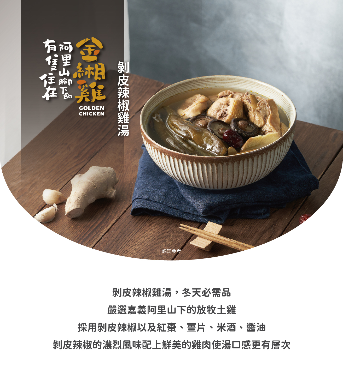 來自嘉義阿里山下的放牧土雞,選用甘甜微辣的剝皮辣椒,經過燉煮後香辣完美釋放到湯頭,喝起來開胃過癮,讓人意猶未盡的好滋味。