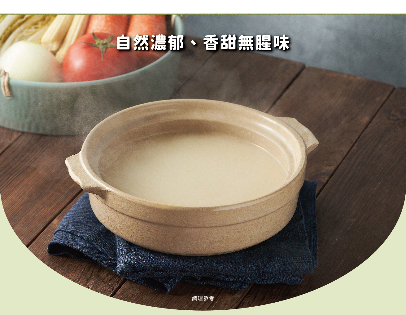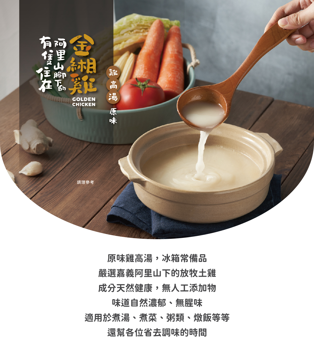 選用雞爪和雞骨架厚工熬製而成,湯頭濃白,喝得到滿滿膠質,無任何調味及添加物,適合用於煮湯、熬粥、燉飯等料理,營養、快速又方便。