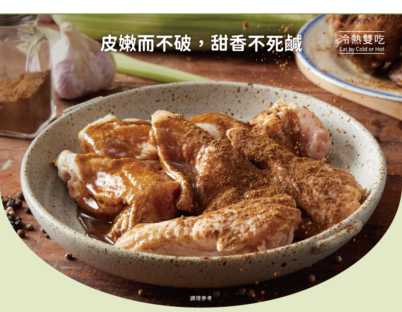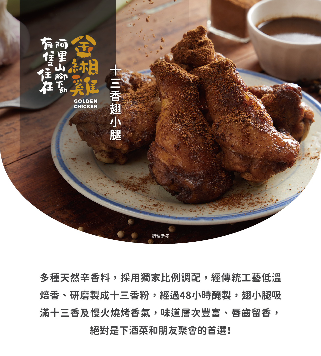 多種天然辛香料,採用獨家比例調配,經傳統工藝低溫焙香、研磨製成十三香粉,經過48小時醃製,翅小腿吸滿十三香及慢火燒烤香氣,味道層次豐富、唇齒留香!