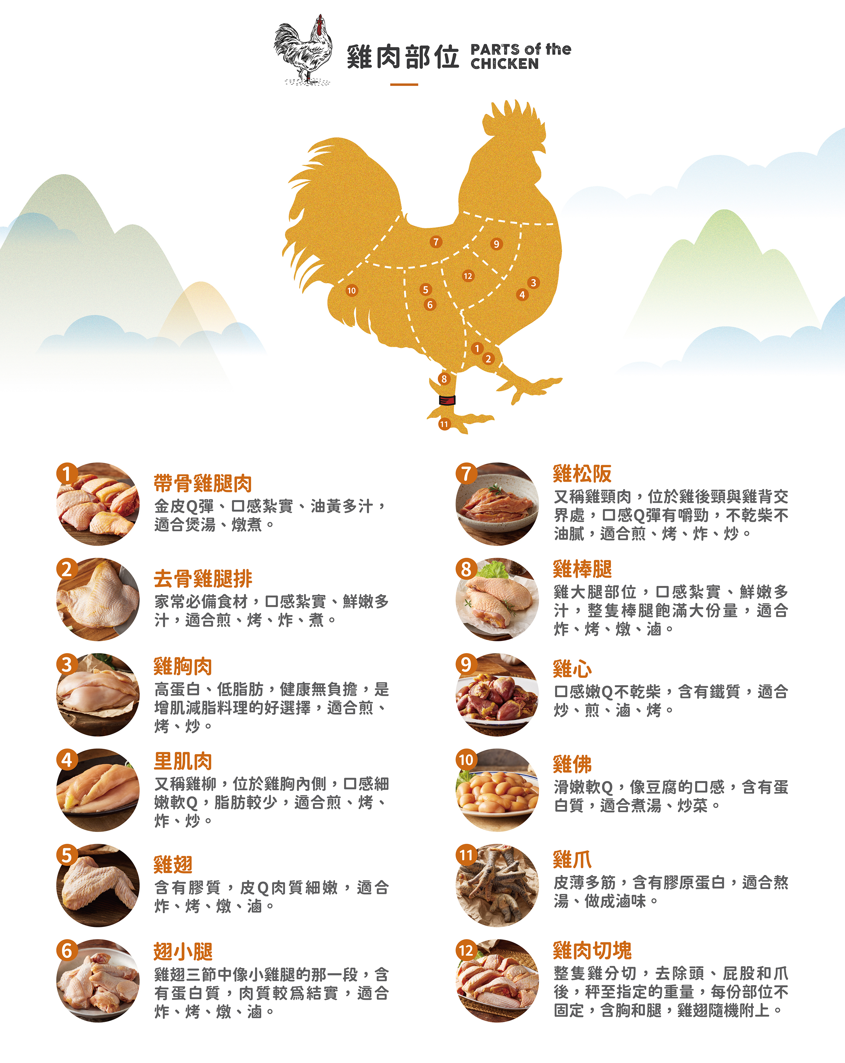 公雞肉質較緊實、油脂較少;母雞肉質則較為軟嫩,富有較多的油脂。