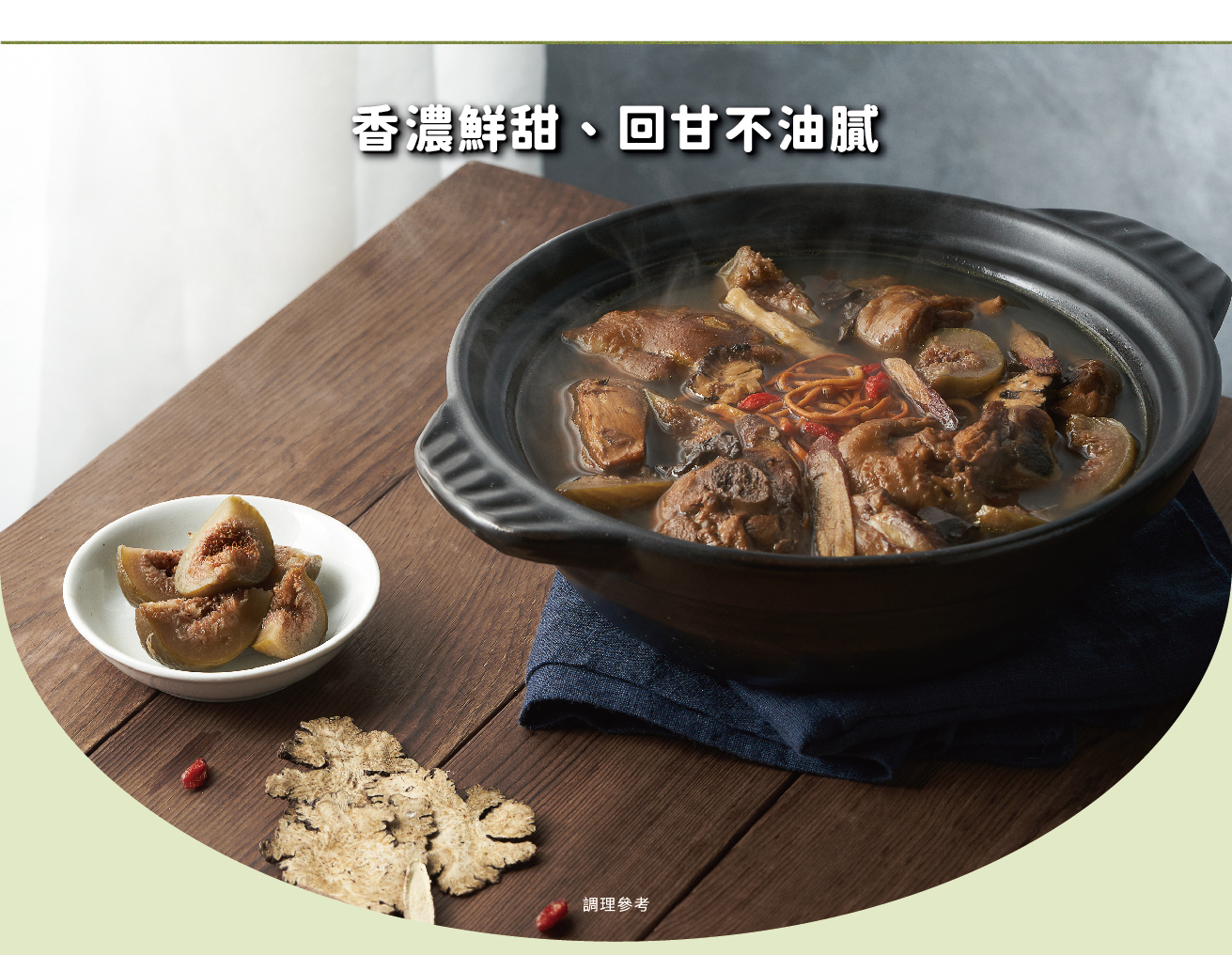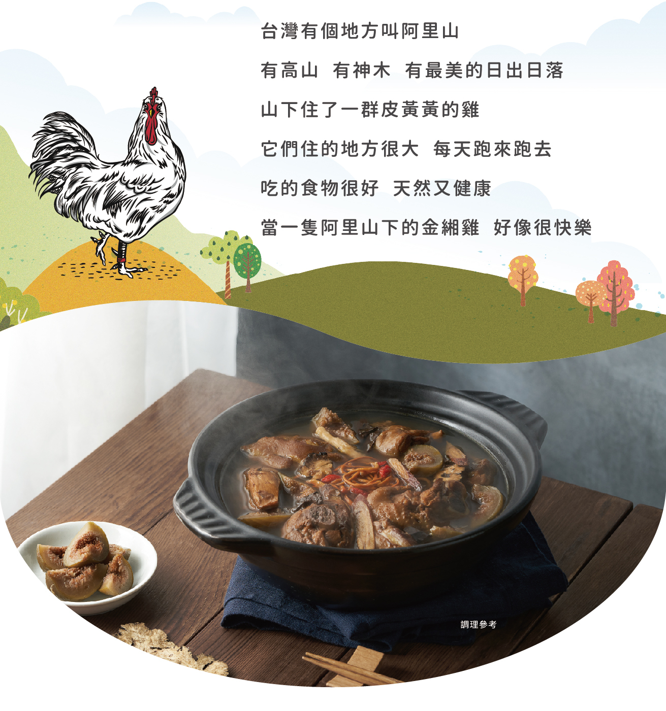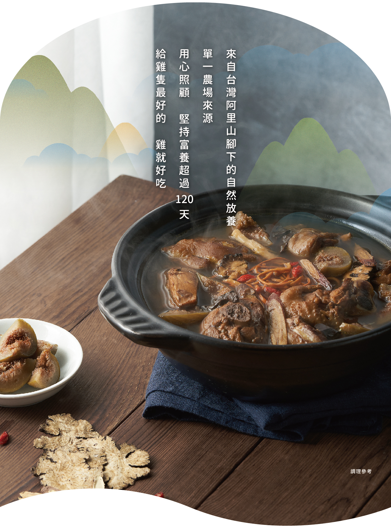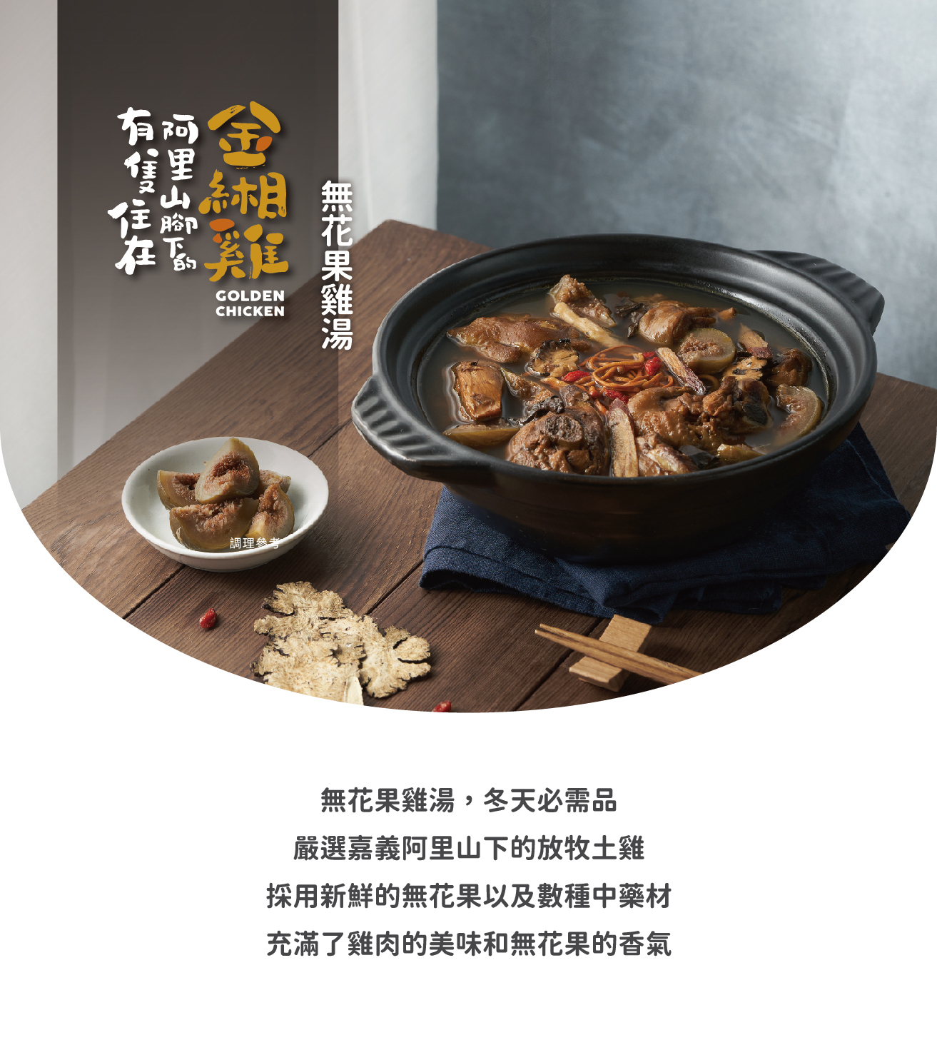 來自嘉義阿里山下的放牧土雞,加入新鮮的無花果和些許中藥材熬煮至濃郁湯頭,溫潤甘甜、香氣十足,營養又健康。