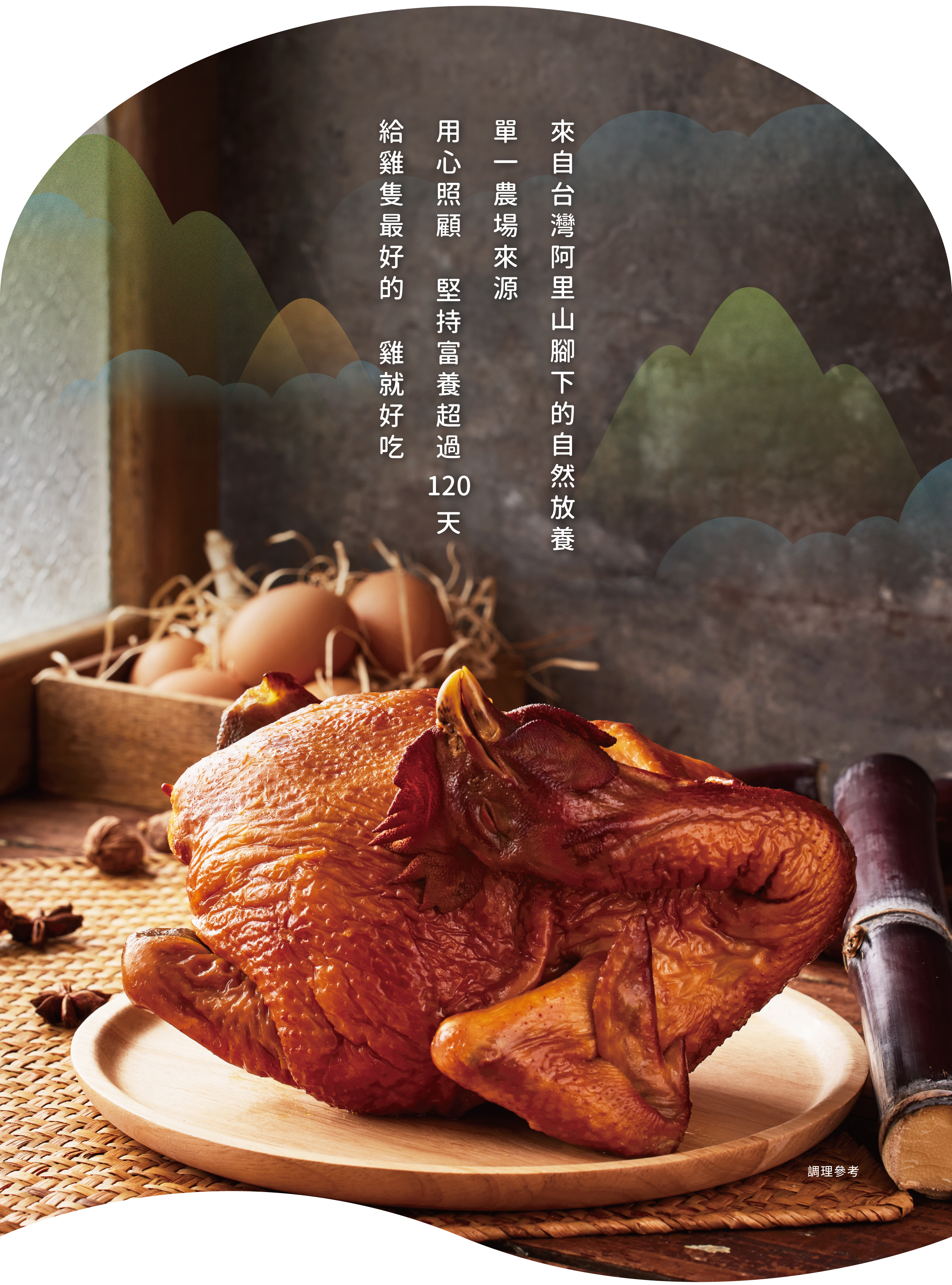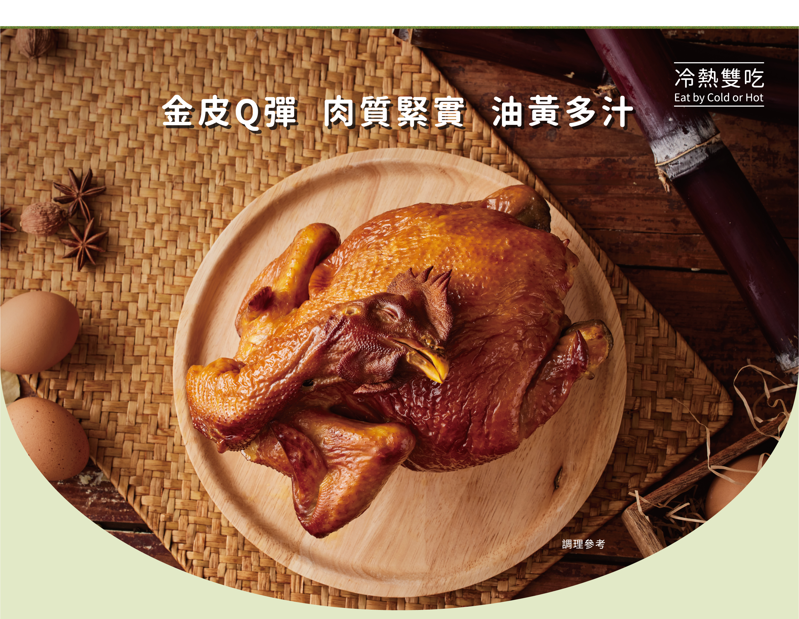 來自嘉義阿里山下的放牧土雞,與最鮮甜的特選甘蔗頭慢火煙燻,逼入香氣,Q彈雞皮燻上一層油亮焦糖色澤,咬上一口,便能感受肉汁與甘蔗甜味的完美融合。
