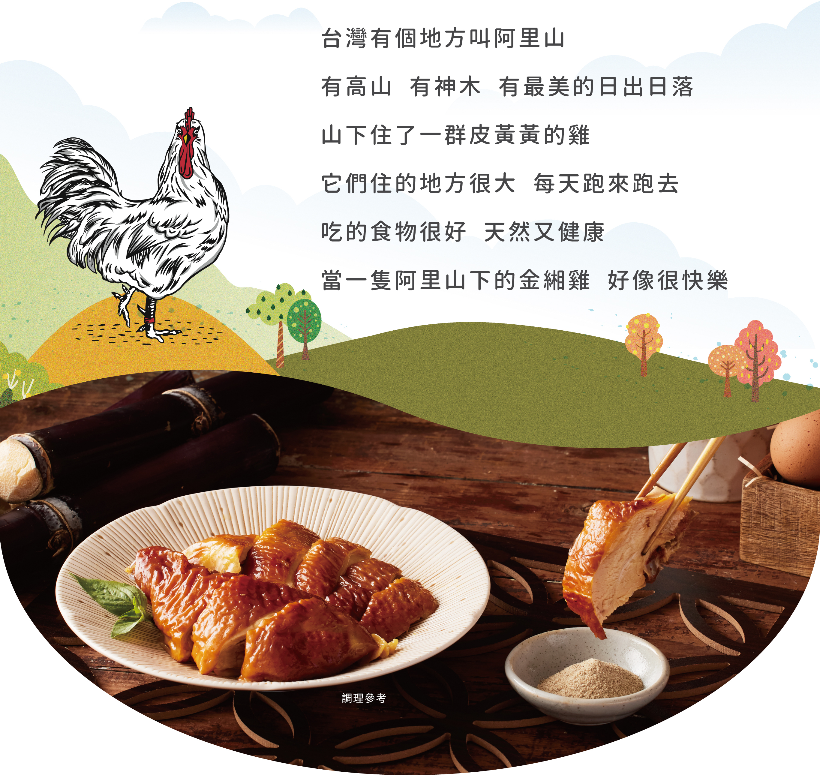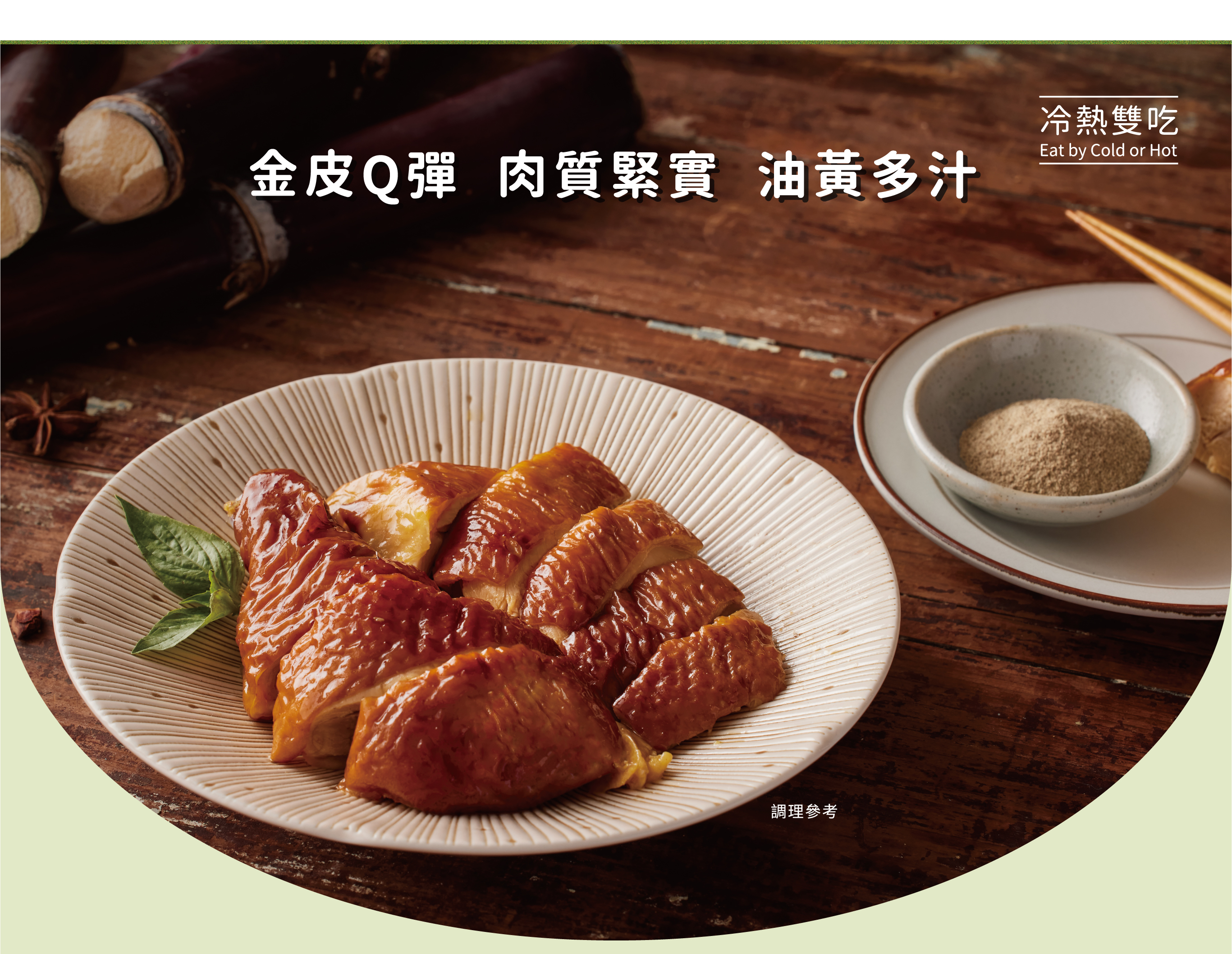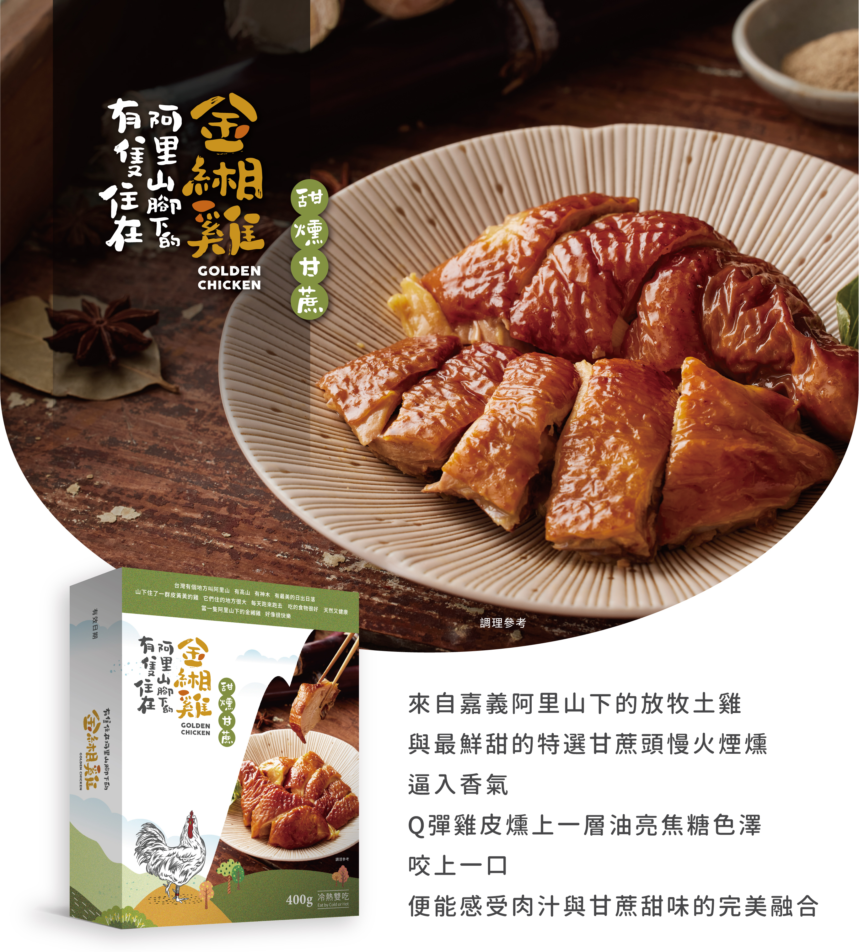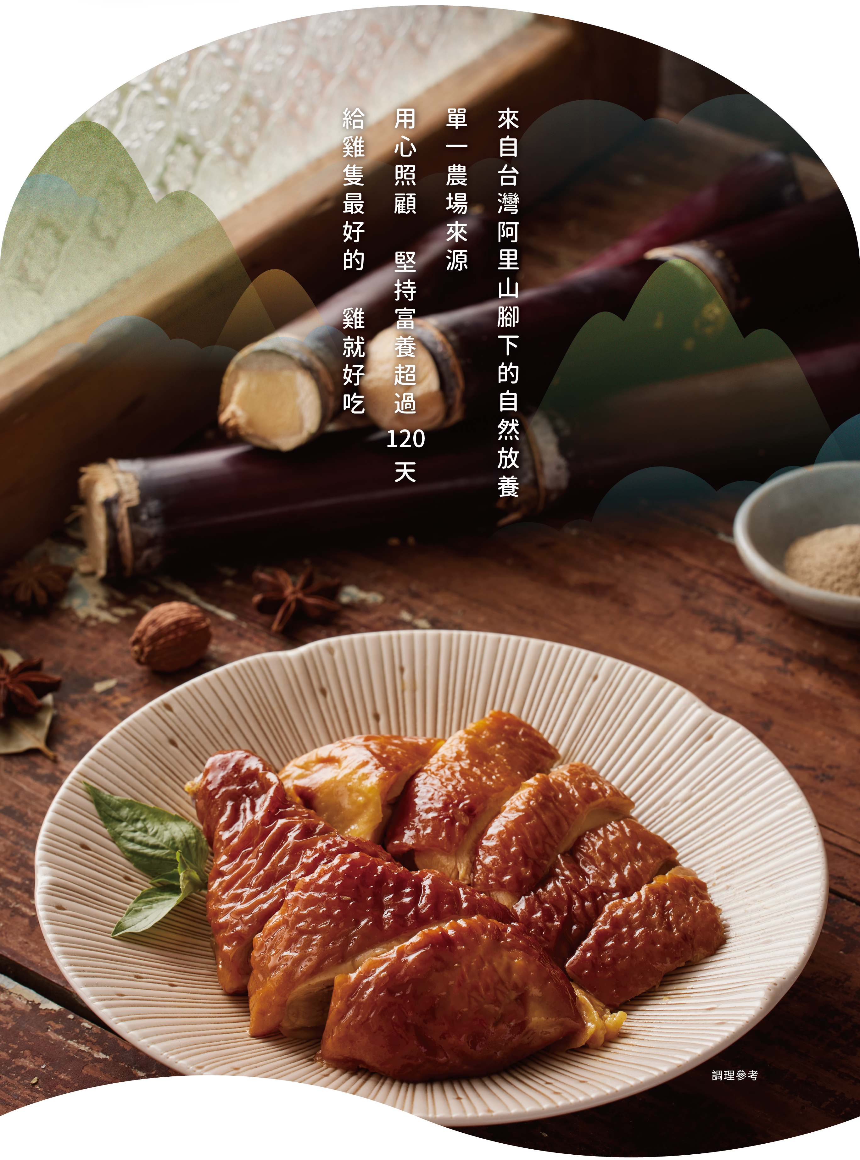 來自嘉義阿里山下的放牧土雞,與最鮮甜的特選甘蔗頭慢火煙燻,逼入香氣,Q彈雞皮燻上一層油亮焦糖色澤,咬上一口,便能感受肉汁與甘蔗甜味的完美融合。