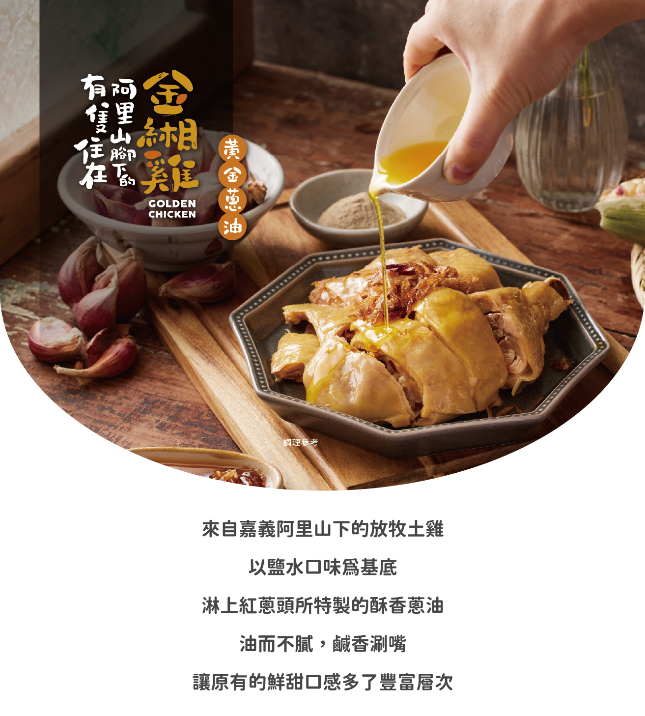 來自嘉義阿里山下的放牧土雞,以鹽水口味為基底,淋上紅蔥頭所特製的酥香蔥油,油而不膩,鹹香涮嘴,讓原有的鮮甜口感多了豐富層次。