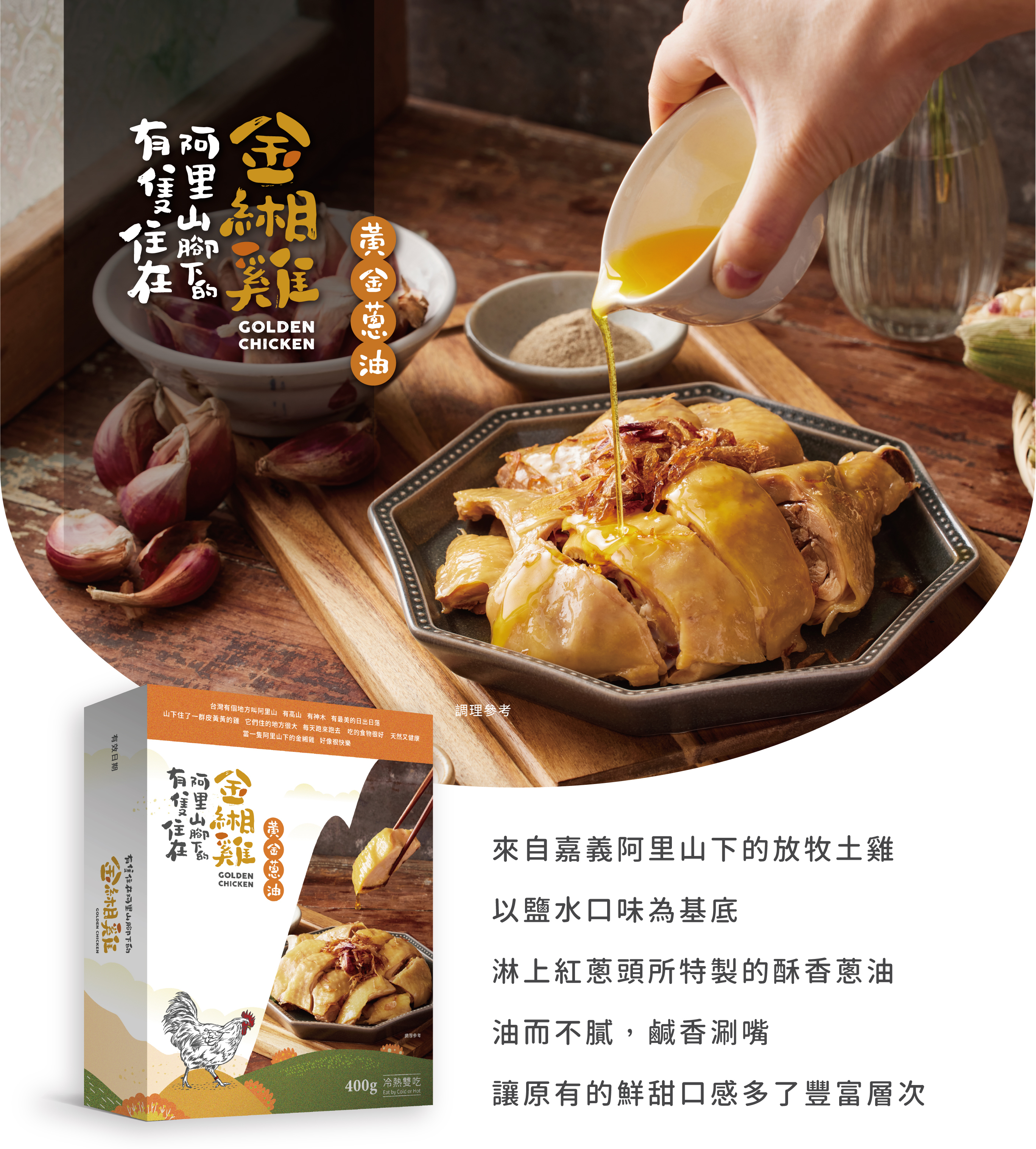 來自嘉義阿里山下的放牧土雞,以鹽水口味為基底,淋上紅蔥頭所特製的酥香蔥油,油而不膩,鹹香涮嘴,讓原有的鮮甜口感多了豐富層次。
